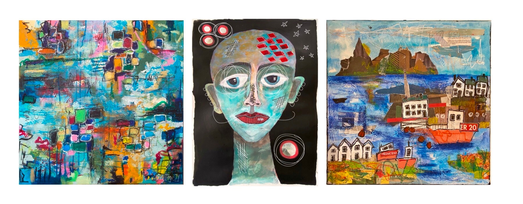 Her er noen eksempler av den fargerike typen (men på søndag skal du få se at du kan lage sarte, rolige bilder med mixed-media også):